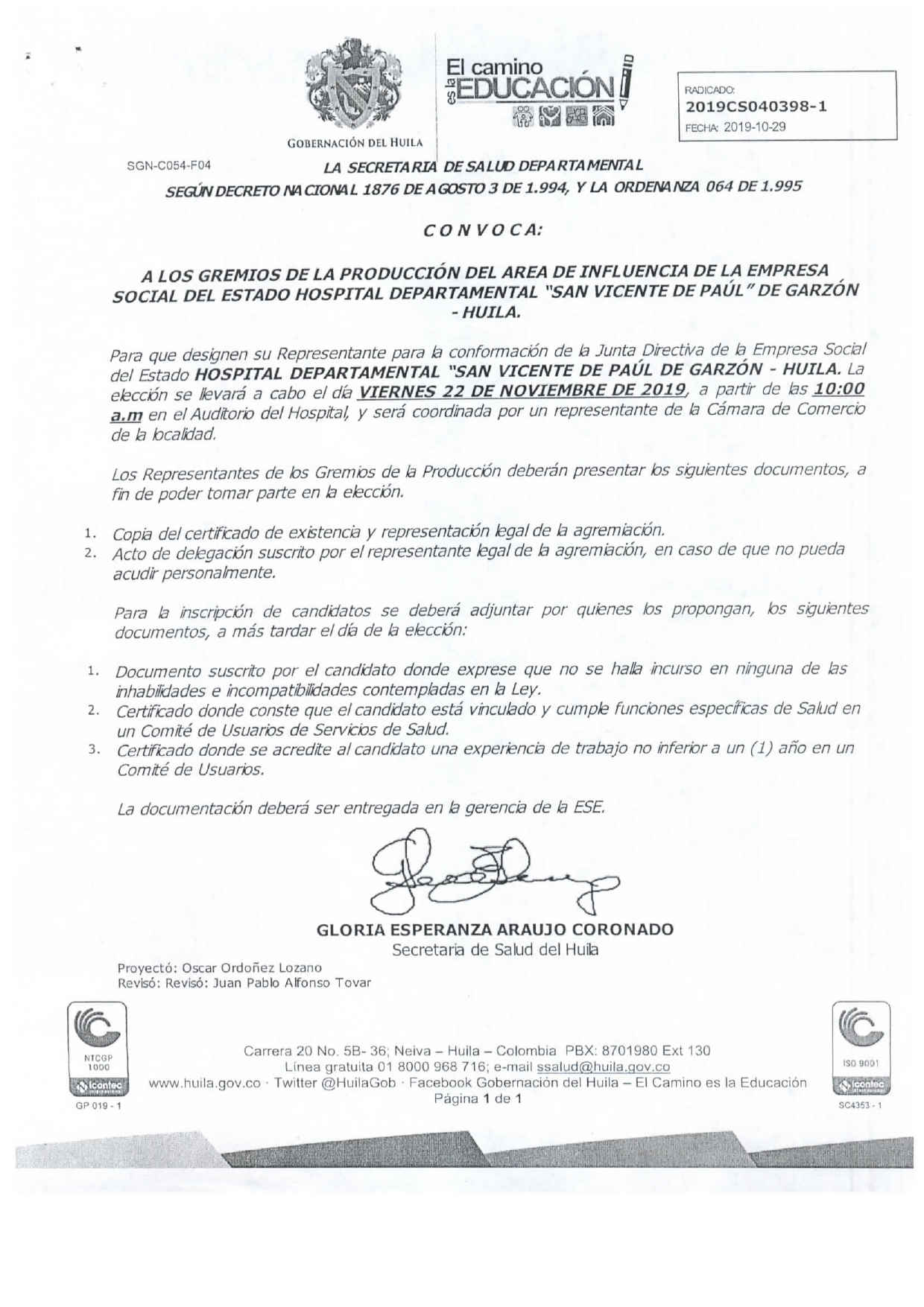 La E.S.E convoca a los representantes de los gremios de la producción para la elección ante la junta directiva.