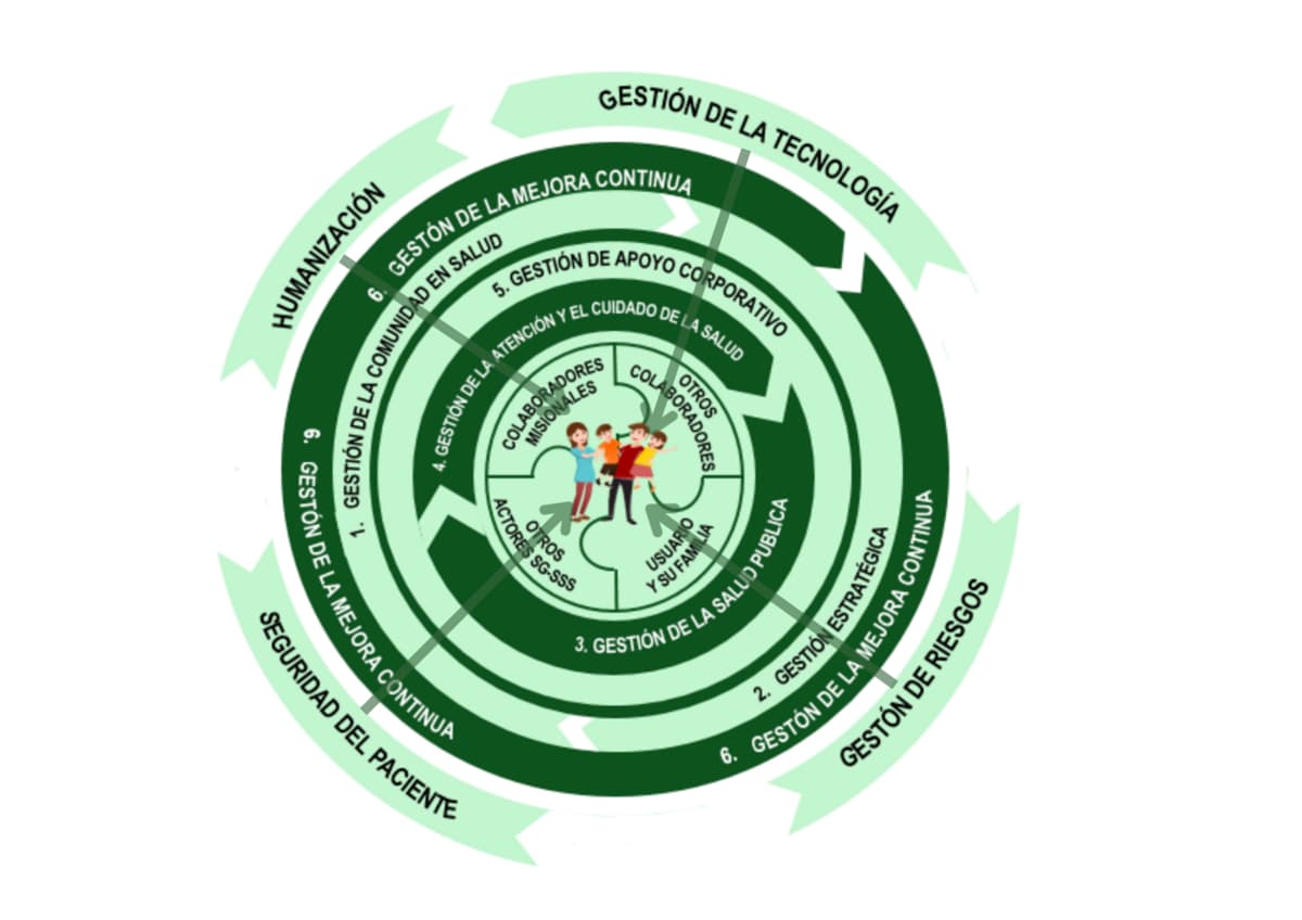 - Procesos (6): Gestión de la comunidad en salud, gestión estratégica, gestión de la salud pública, gestión de la atención y el cuidado de la salud, gestión de apoyo corporativo, gestión de la mejora continua.